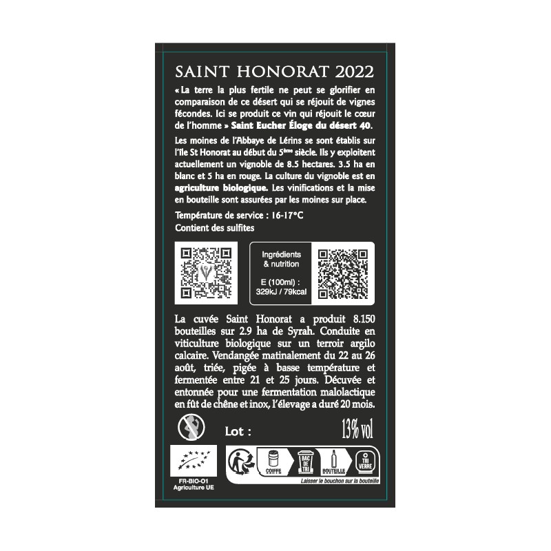 An intense and brilliant purple color with purple reflections adorns this Saint Honorat. A first nose of raspberry, blackberry and green pepper reveals a complex aroma that is found on the palate, carried by a beautiful acidity and an intense tannic structure.