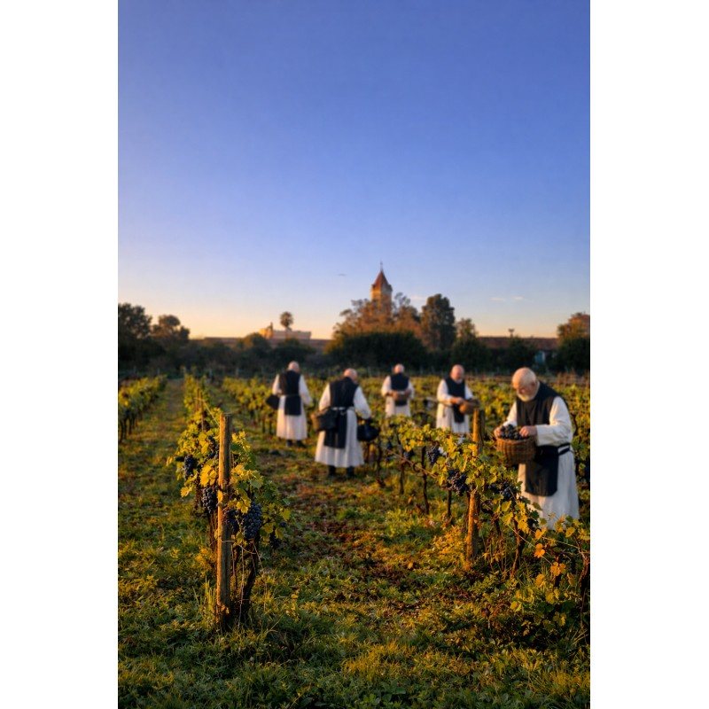 Il commence bien avant, dans le calme de l’aube, quand les moines s’avancent entre les rangs, sécateur en main, prières en silence.